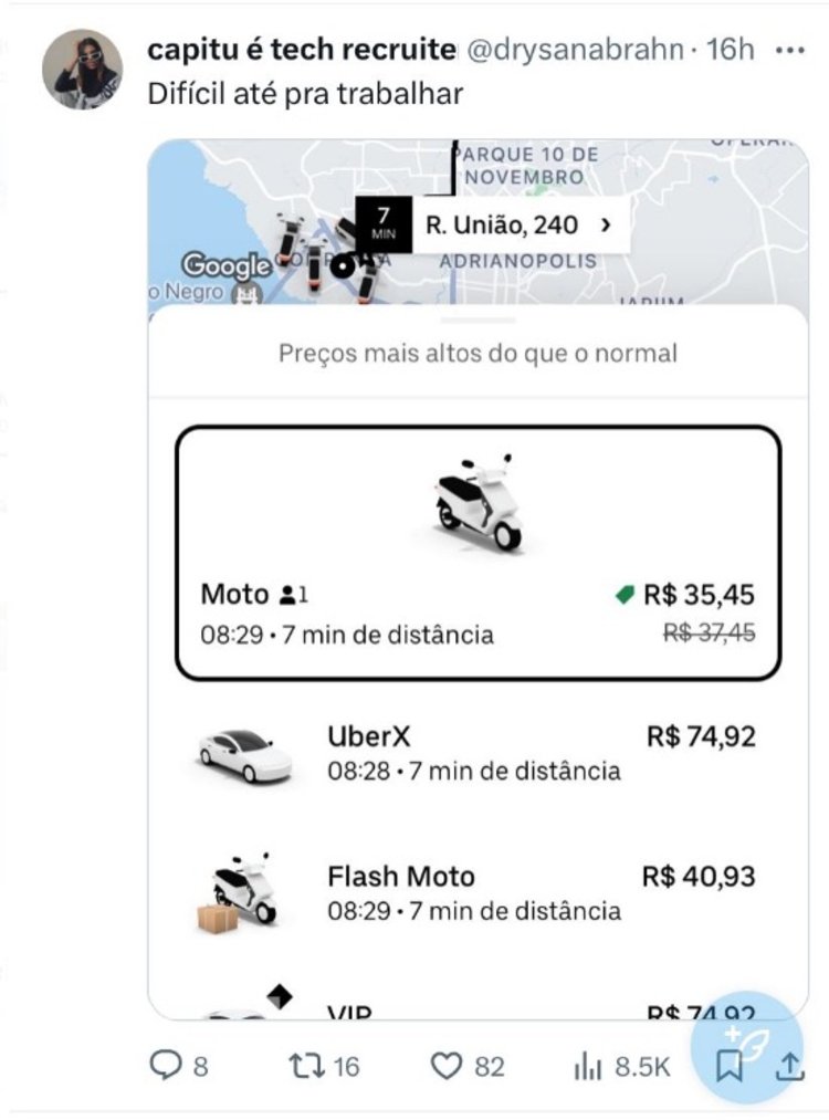 O preço do Uber disparou em Manaus nos últimos dias devido ao período natalino. Em dias de chuva, o valor da corrida chega a triplicar como é o caso deste sábado (16). Uma corrida que antes custava em torno de R$ 20, hoje pela manhã com a forte chuva que atinge a cidade, chegou a […]