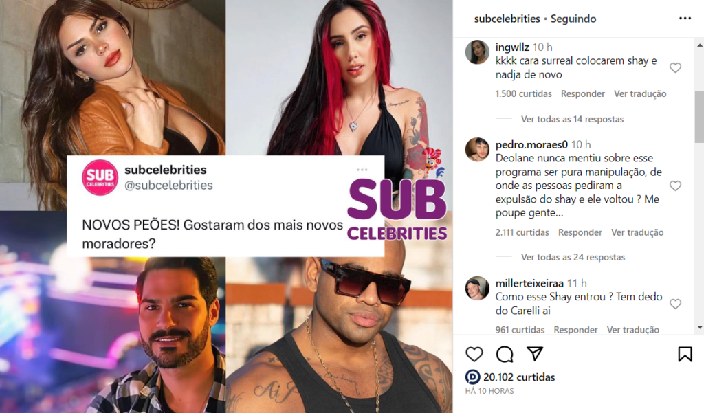Em outro comentário com mais de 2 mil curtidas, um internauta apontou: “Deolane nunca mentiu sobre esse programa ser pura manipulação. De onde as pessoas pediram a expulsão do Shay e ele voltou? Me poupe gente”. Em mais um comentário sobre uma possível manipulação, um internauta teorizou: “Como esse Shay entrou? Tem dedo do Carelli [diretor da atração] aí!”.