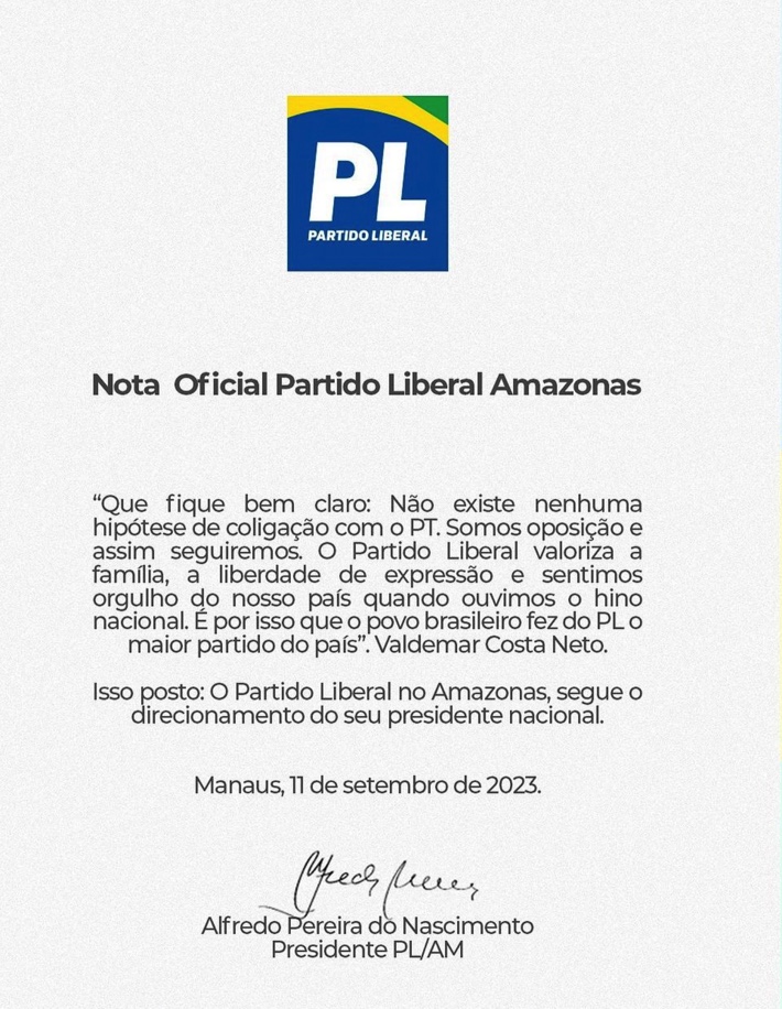 A posição de Alfredo Nascimento foi oficialmente divulgada em uma nota oficial emitida pelo Partido Liberal do Amazonas no dia 11 de setembro de 2023. Na nota, o líder do PL afirmou: “Que fique bem claro: Não existe nenhuma hipótese de coligação com o PT. Somos oposição e assim seguiremos. O Partido Liberal valoriza a família, a liberdade de expressão e sentimos orgulho do nosso país quando ouvimos o hino nacional. É por isso que o povo brasileiro fez do PL o maior partido do país.” – Valdemar Costa Neto.