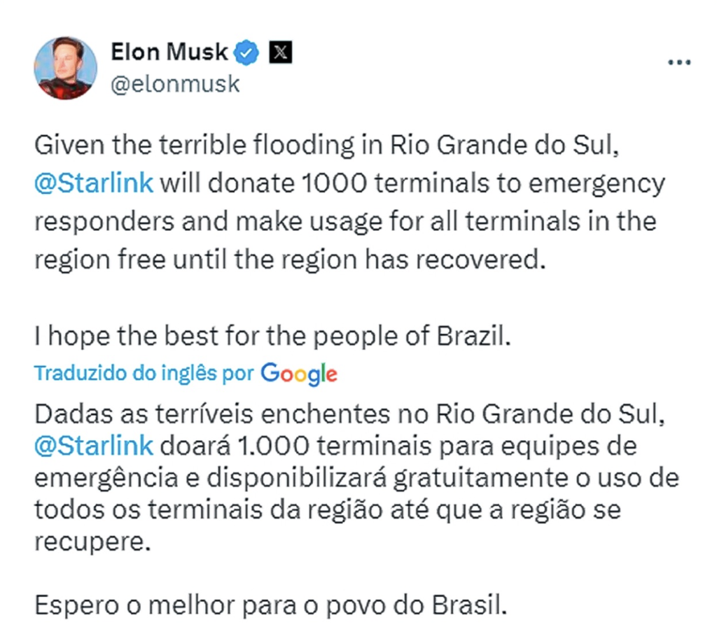 Elon Musk, o visionário empresário por trás da SpaceX e da Tesla, fez um anúncio impactante nas redes sociais. Em uma publicação no X, antigo Twitter, Musk afirmou que a Starlink, sua empresa de internet por satélite, estaria doando mil terminais para socorristas do Rio Grande do Sul.