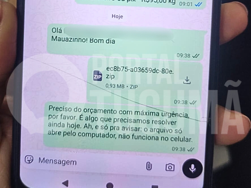 O golpe chegou por meio de uma mensagem que pedia um orçamento com “máxima urgência”. A conversa, da qual o Portal Tucumã teve acesso, mostra o criminoso afirmando: “Preciso do orçamento com máxima urgência, por favor. É algo que precisamos resolver ainda hoje. Ah, e só pra avisar: o arquivo só abre pelo computador, não funciona no celular”. Junto à mensagem, foi enviado um arquivo ZIP de aproximadamente 0,93 MB.