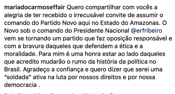 Em sua publicação, Maria do Carmo compartilhou sua alegria ao receber o convite irrecusável para assumir a liderança do Partido Novo no Amazonas. Ela destacou a importância do partido em fazer oposição responsável, defendendo a ética e a moralidade na política. A empresária expressou sua honra em estar ao lado de pessoas que acredita que podem mudar o rumo da história política no Brasil. Seffair agradeceu a confiança depositada em seu trabalho e afirmou que será uma “soldada” ativa na luta pelos direitos e pela democracia. Veja: