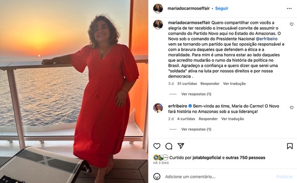 Para marcar o anúncio, Maria do Carmo postou uma foto vestindo um traje na cor laranja, que representa o Partido Novo. Ela expressou sua empolgação com a nova cor favorita e reforçou seu compromisso com a construção de um Novo Amazonas e um Novo Brasil.