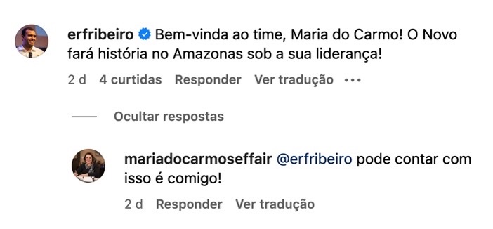 O presidente nacional do Partido Novo, Eduardo Ribeiro, também se manifestou após o anúncio de Maria do Carmo. Ele deu as boas-vindas à empresária, destacando que o partido fará história no Amazonas sob sua liderança.