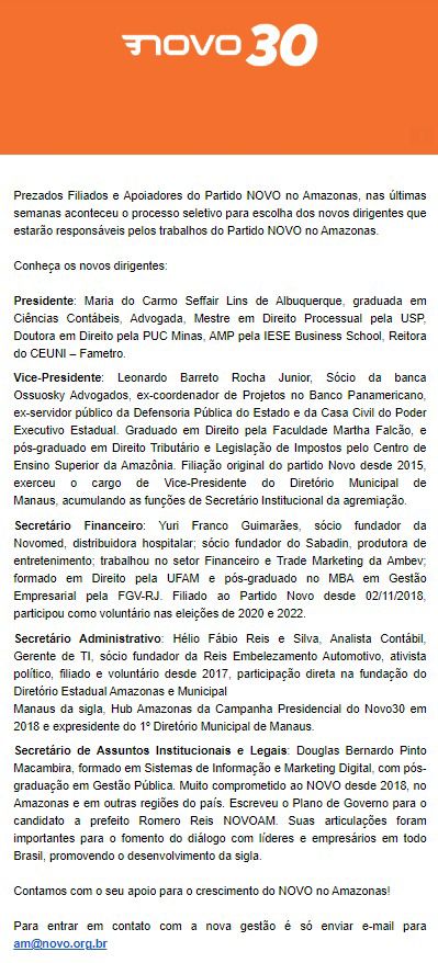 Por unanimidade, em reunião deliberativa no partido, decidiram que a chapa “Decola NOVO Amazonas”, irá assumir a Comissão Provisória do Diretório Estadual do Amazonas. Confira: