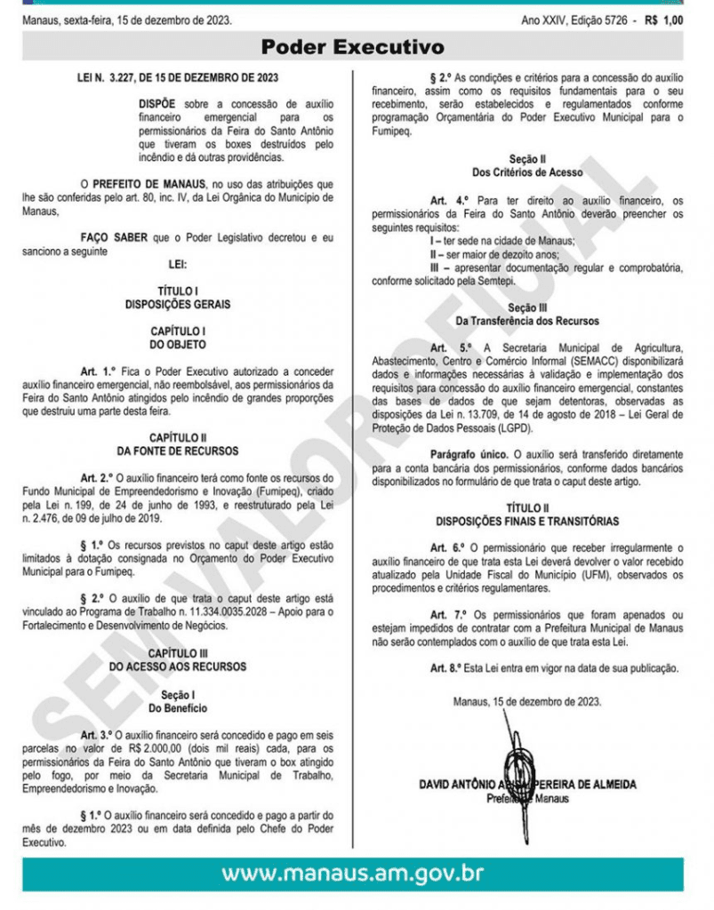 Feirantes que perderam boxe no incêndio na Feira do Santo Antônio, na zona oeste de Manaus, no dia 4 de dezembro, receberão auxílio de R$ 12 mil da prefeitura. O valor será pago em seis parcelas de R$ 2 mil cada, conforme determina a Lei nº 3.227, de 15 de dezembro de 2015.