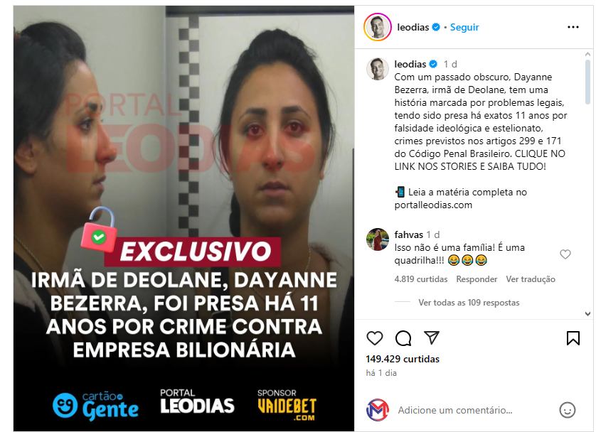 Nas últimas semanas tem circulado em toda a mídia passagens da vida de Deolane Bezerra e de suas irmãs que mostram o envolvimento ou proximidade com atividades criminosas. E nessa quinta-feira, 19, o Portal LeoDias divulgou, com exclusividade, a informação de que a irmã mais nova de Deolane, Dayanne Bezerra, já foi presa, exatamente 11 anos atrás, no dia 19 de setembro de 2013, quando tinha 23 anos.