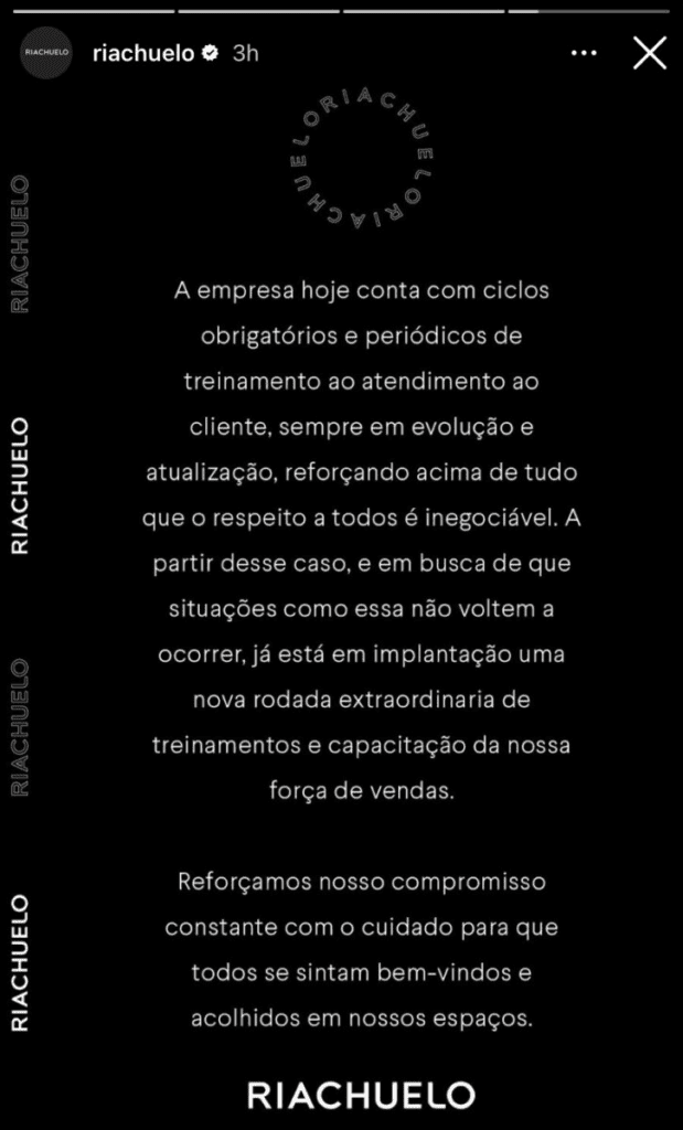 Por meio de nota, a Riachuelo lamentou o ocorrido, disse que o comportamento da funcionária não está de acordo com os valores defendidos pela empresa e que uma nova “rodada extraordinária” de treinamentos e capacitação foi implantada.