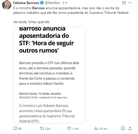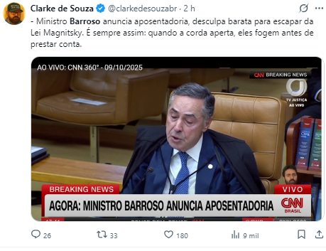 “Barroso anuncia aposentadoria no STF e sai marcado como o presidente da corte que permitiu que a ditadura do Judiciário avançasse no País”, declarou Jordy, afirmando que o ministro teria deixado o cargo “antes que viessem as consequências internacionais de seus atos”.