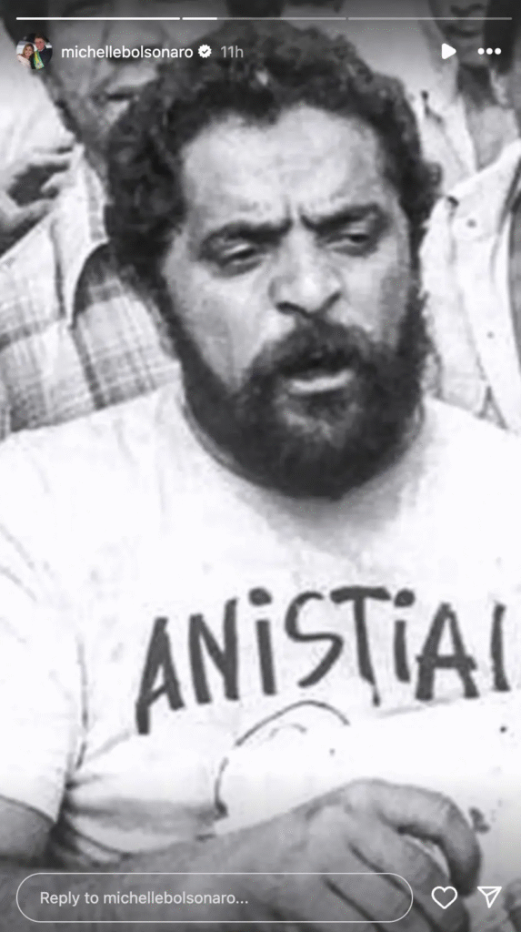 Michelle compartilhou a foto nos stories do seu perfil do Instagram. A publicação ocorreu um dia depois de a Câmara dos Deputados aprovar a urgência do projeto que concede o perdão a condenados pela participação nos atos de 8 de janeiro de 2023. A medida, portanto, pode beneficiar o ex-presidente Jair Bolsonaro, condenado por suposta tentativa de golpe de Estado na semana passada.
