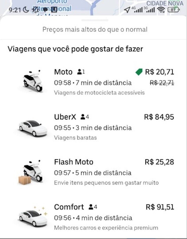 O preço do Uber disparou em Manaus nos últimos dias devido ao período natalino. Em dias de chuva, o valor da corrida chega a triplicar como é o caso deste sábado (16).