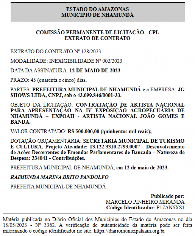 A Prefeita de Nhamundá, Raimunda Marina Brito Pandolfo( PSD), mais conhecida como ‘Marina Pandolfo”, gastou mais de R$ 500 mil reais dos cofres públicos para contratar o show do cantor João Gomes em um festival do município.