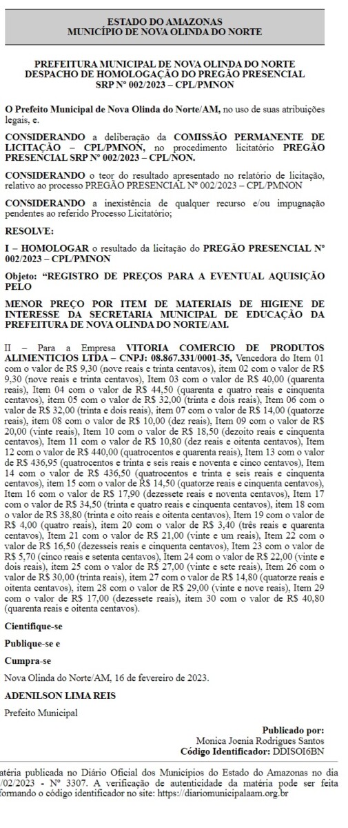A Prefeitura de Nova Olinda do Norte, comandada pelo prefeito Adenilson Reis (MDB), também está, aparentemente, gastando milhões desnecessários. O município em questão, gastará R$ 1, 4 milhão na compra de materiais de higiene pessoal, como papel higiênico, álcool em gel, babadores infantis, fraldas descartáveis, colônias, talco, pomada para assaduras, entre outros itens para escolas.