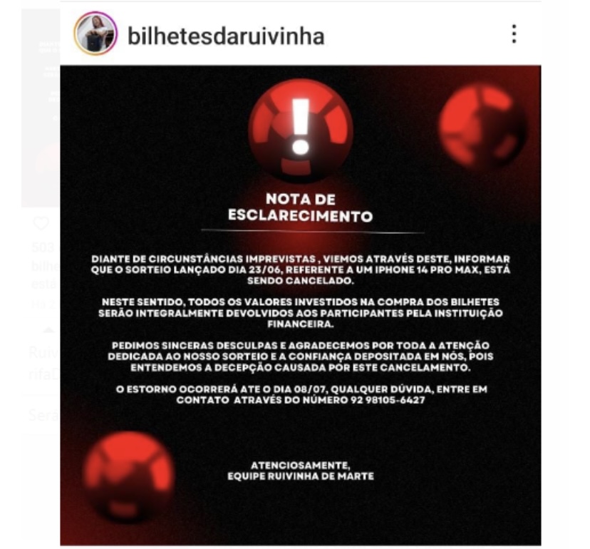 A nota diz que o cancelamento ocorre ”diante de circunstâncias imprevistas” e que o dinheiro de quem comprou os bilhetes será devolvido. O sorteio do Iphone foi lançado no dia 23 de junho no perfil de Ruivinha e o valor será ressarcido aos participantes até o dia 8 deste mês.