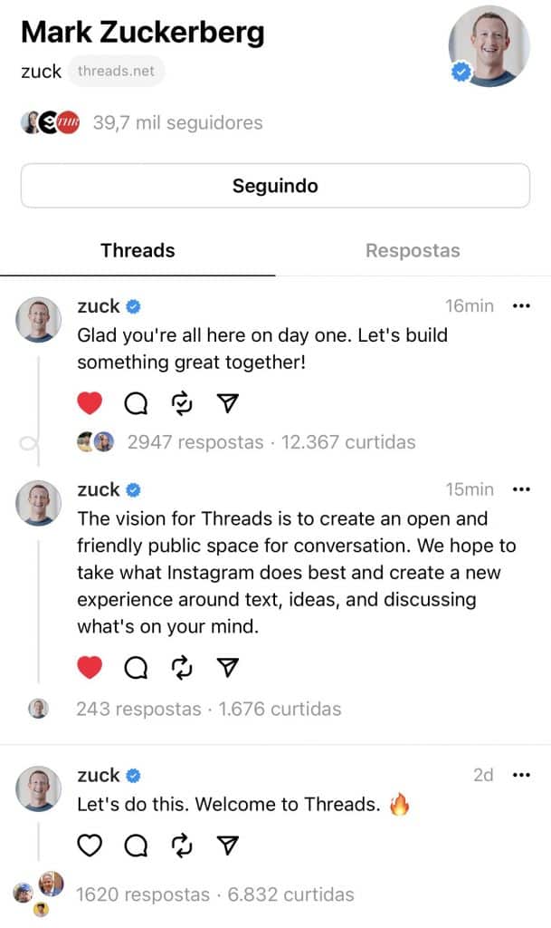 Ainda nesta quarta-feira (5), Mosseri e o CEO da Meta, Mark Zuckerberg, estrearam a plataforma realizando as primeiras publicações. Enquanto o chefe do Instagram postou sobre objetivo e recursos da rede, Zuckerberg deixou apenas uma mensagem de “Bem-vindos”.